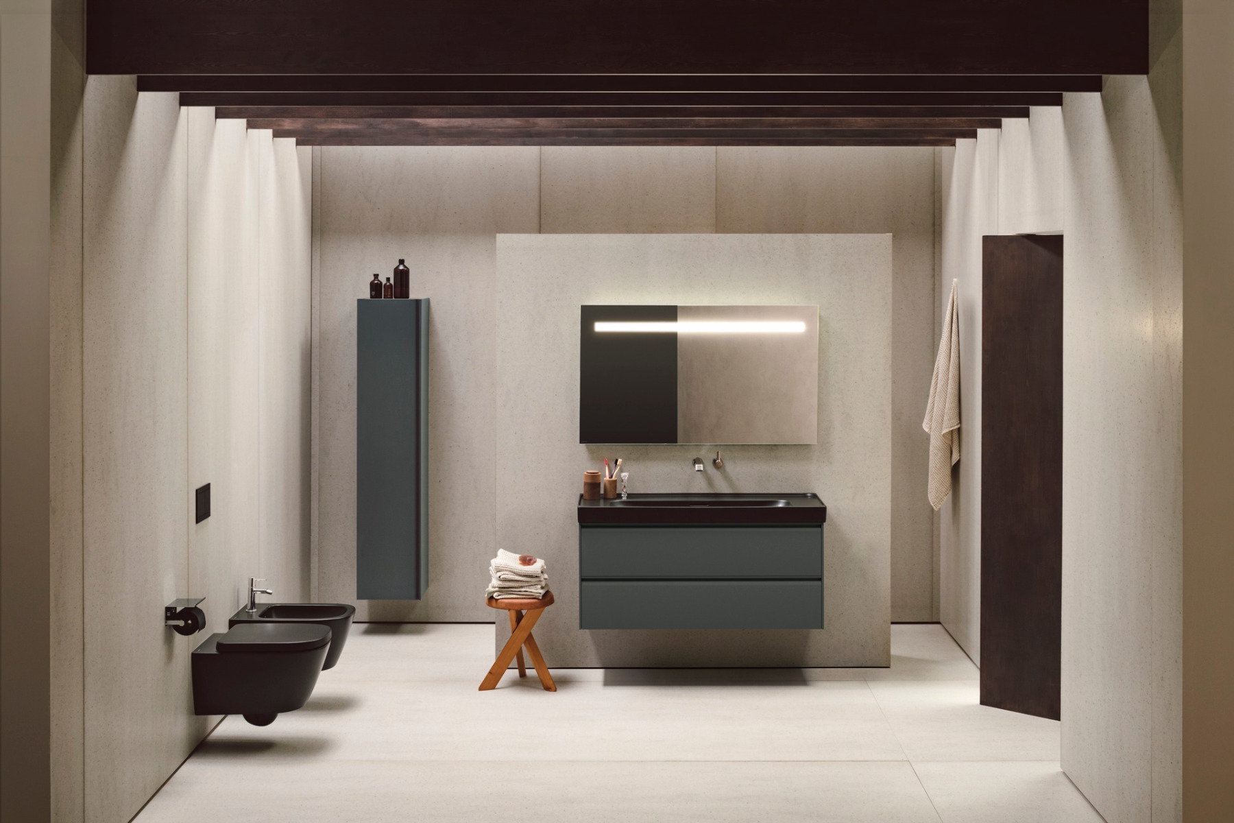 Meda includes a complete range of fittings for the washbasin, bath, bidet and shower, which is also available in a matt titanium black. © Laufen