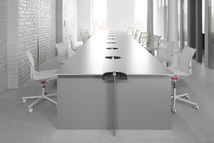 Zusammen mit den Designern Mirko Borsche und Stefan Diez sowie Gonzalez Haase Architekten hat Wagner Living das flexible Möbelsystem D2 entwickelt. Aus einer Art Baukasten mit Aluminiumprofilen, Verbindern aus hochglanzpoliertem, massivem Aluminium und Wabenplatten aus Karton oder Aluminium lässt sich eine komplette Einrichtung in Leichtbauweise realisieren: von Wänden über Kabinen, vom Schallschutz bis zum Messestand. Die Elemente mit individuell bedruckbarer Oberfläche lassen sich ineinanderstecken. Über einen Konfigurator kann das – auch homeofficetaugliche – System individuell gestaltet und verändert werden. Ein erster, in Weiß- und Grautönen gehaltener Prototyp für die flexible Innenarchitektur von Gonzalez Haase ist im rund 300 m2 großen Büro von Mirko Borsche in München entstanden. Im Zentrum steht ein 9 m langer, dreiteiliger Arbeitstisch aus 11,5 mm starken Aluminiumleichtbauplatten. Stauraum bieten weitere Möbel aus 4 cm dicken Pappwabenplatten in unterschiedlichen Farbkombinationen in den Archivräumen.