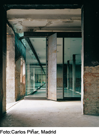 In a number of phases, the Matadero, a former slaughterhouse compound built in the early 20th century in Madrid, is to be transformed by 2011 into a multi-disciplinary cultural centre. Hall 17c is now home to Intermediæ, an institute for contemporary art, which intends first and foremost to shed light on creative processes, as well to foster experimentation and interaction. The architects limited their interventions to a bare minimum – probably due, as well, to a budget of only 700 000 euros. All of the vestiges of the past remain visible, e.g. the residue of cork insulation which recalls the former use as cold storage, as well as evidence of repair work, for example, of the columns. Missing portions of walls were left untouched, as if they had just been jackhammered; ducts and wiring are surface mounted and remain visible. These interventions are clearly legible, and are, in the architects’ words, “very few, very rigorous, very clean and very straight”. To this end they employ materials typically used in industrial settings, off-the-shelf, without further processing. A large steel sliding door in an exterior wall of the compound points the way, via a gently inclined steel ramp and then through a steel sliding door, to the foyer. Here a long counter – made of welded steel plate – dominates a space otherwise almost completely untouched. An office and the sanitary facilities are situated behind the counter, both also clad in steel plate. Polished concrete was selected as floor material here and in the adjacent, multi-functional halls. A glass box in a long room along the southwest facade contains the only climatized space. Sectional steel, primarily in the form of steel channels, are used here in a variety of ways: as floor material – both standard and in raised flooring – and as profiles to hold glazing in place.