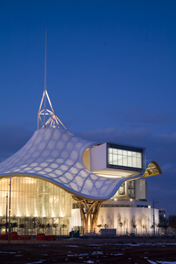 Like the parent building in Paris, the new Centre Pompidou in Metz was conceived as an innovative location for the arts. In addition to volumes for exhibitions stacked above each other in offset form, there are halls and other facilities for various activities. In the evening, the hexagonal pattern of the load-bearing timber roof structure, is visible through the translucent covering membrane. Around the central mast and the exhibition boxes, the structure is fixed to large steel rings and extends inwards to four funnel-shaped supporting piers. Internally, the 37-metre-high hall is flooded with light. Through facades in transparent corrugated polycarbonate sheeting, the building opens itself to the outside world.