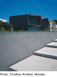 The sculptural form of the upper storey, with its dark-grey rendered finish, is set off against the plinth-like structure of the ground floor, which is clad with untreated aluminium panels. Similarly, the bright, warm tones of the internal finishings are contrasted with the dark exterior.