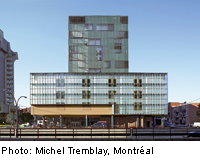 Built in 1970, and comprising 21,000 m2, the building complex accommodating the Quebec Tourism and Hotel Institute (abbreviated ITHQ) sets an accent within Montreal’s urban fabric as block-filling, four-storey podium topped by a seven-storey tower. With a subway station integrated in the ground floor, the internationally acclaimed education facility for tourism, hotel studies and gastronomy thereby accommodates public infrastructure as well. In order to convey the institute’s significance and contents to the public in a contemporary fashion, the building’s interiors were completely overhauled. The existing facade was fitted with thermal insulation and new cladding; a second skin of glass draped over the original one bestows the building with transparency and depth. The building massing is now articulated by the glass elements with their varying colours and sizes, as well as by the different functions it houses. The amenities on the ground floor which are accessible to the public, such as restaurant, entrance and lobby areas, are glazed on all sides and are clearly visible around the clock from the outdoors. Colossal lettering imprinted on the podium’s smooth, wrap-around glass ribbon communicate the building’s functions visually to the surrounding city.