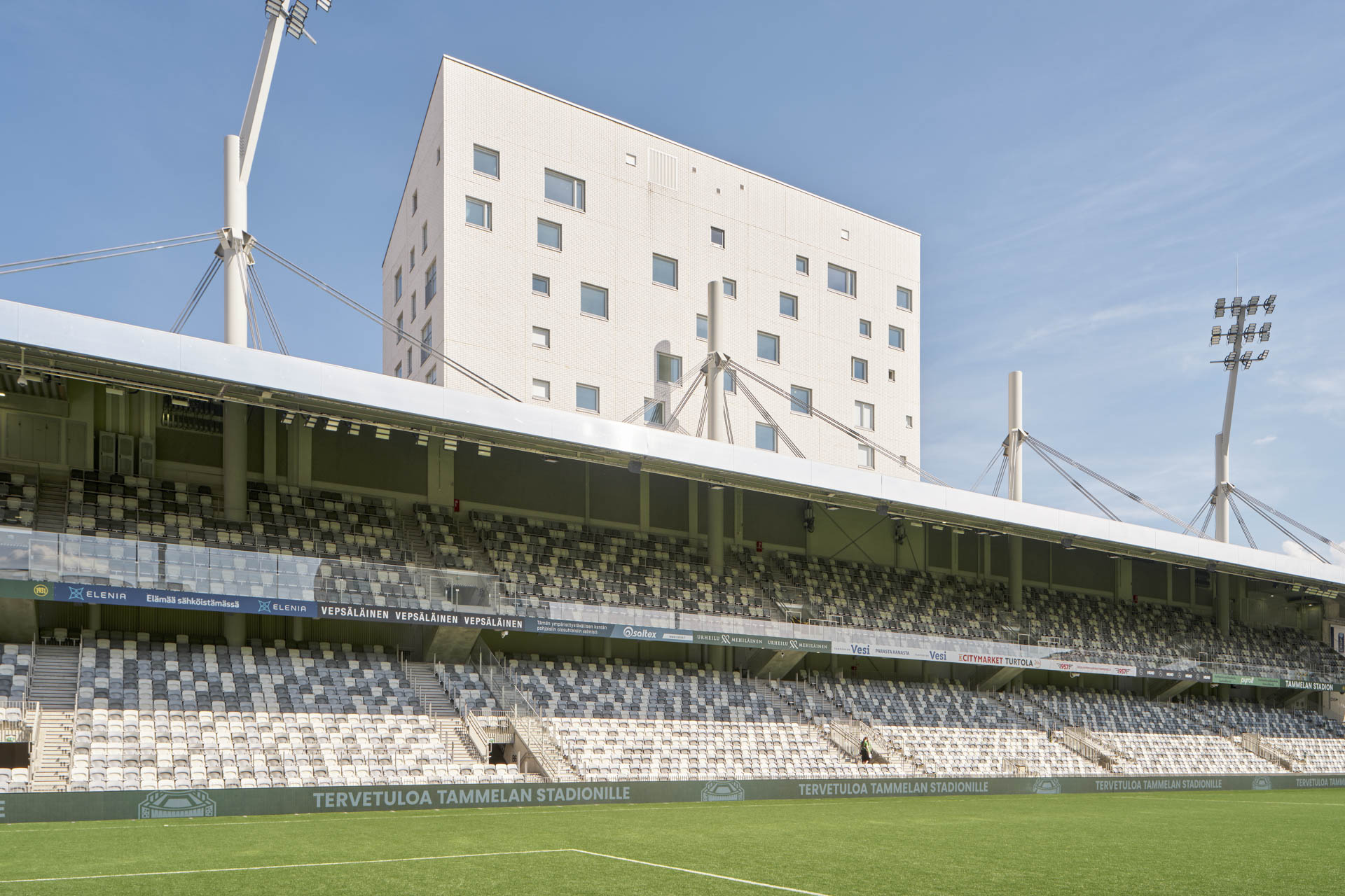 A football pitch in the middle of a housing block? This unusual mixed-use development in the Finnish city of Tampere began as a bold vision. Where some live, others watch football. When the stadium of the Ilves Tampere sports club no longer met the requirements of the Finnish Football League, it was decided to build a new stadium on the same site. The city approved the plans, but wanted to densify the central area, and in 2014 held an invited competition to explore the possibilities.