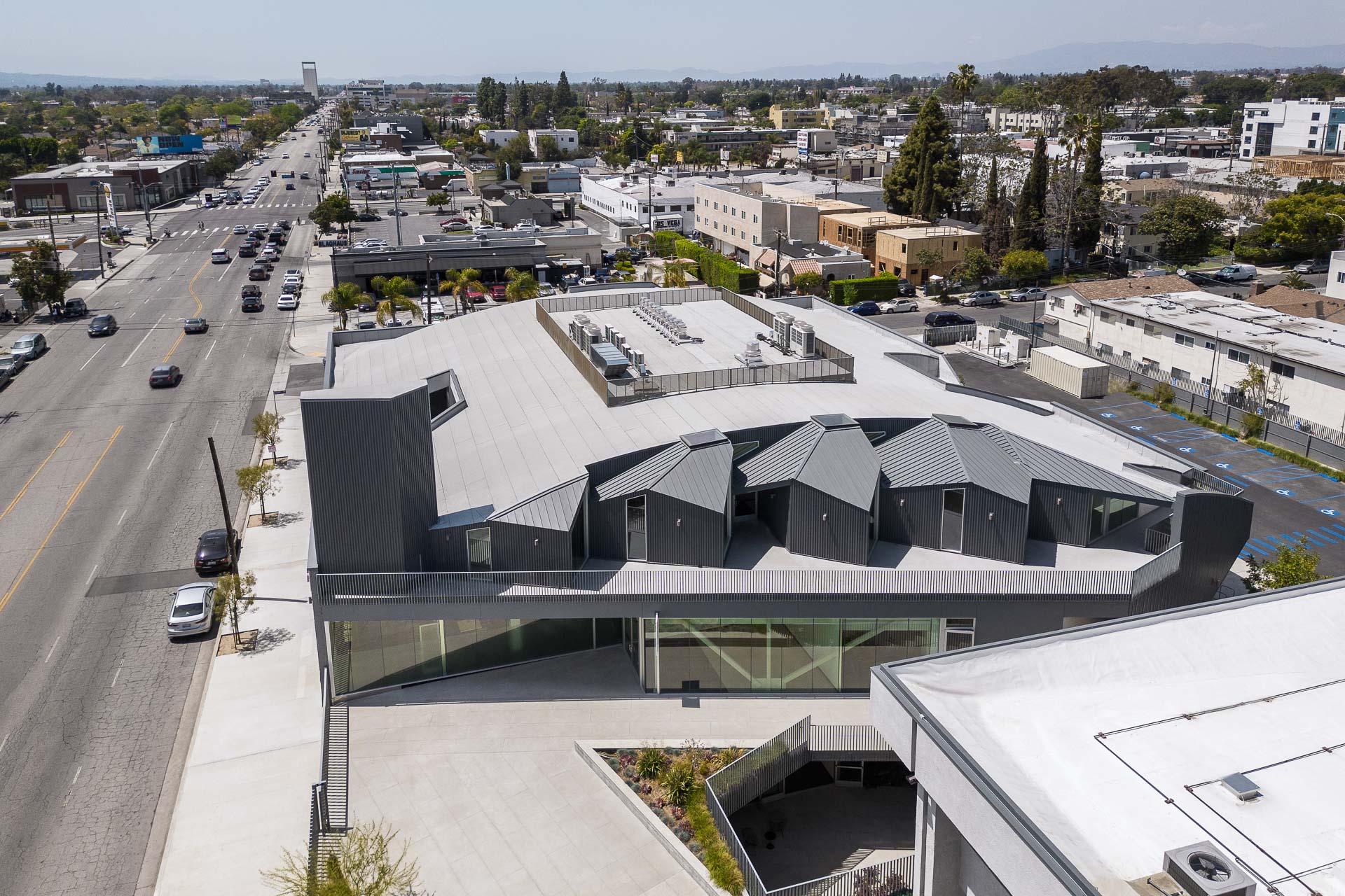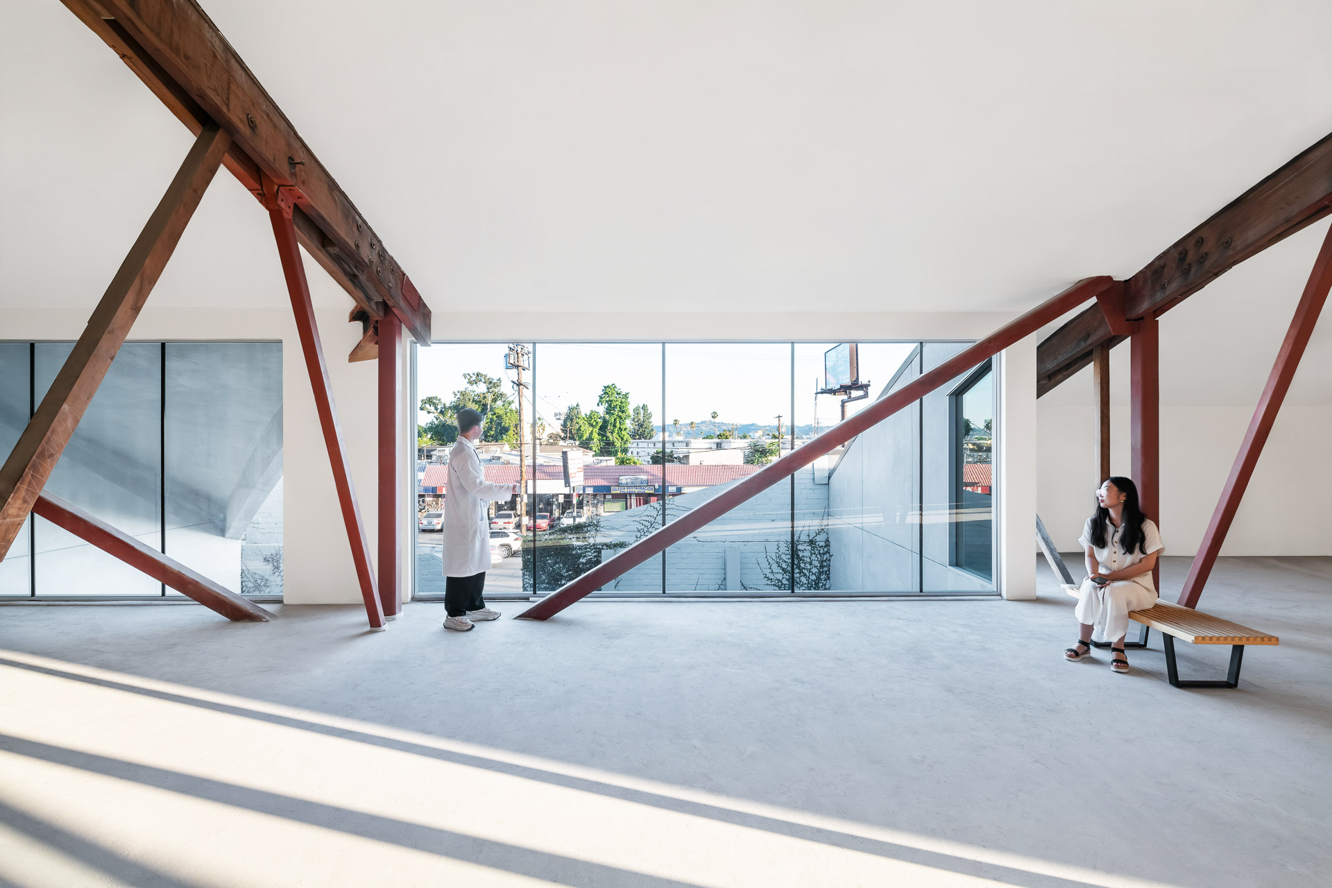 A very central one. It was a generic yet solid structure from shortly after the Second World War, similar to many others found in Los Angeles. Its wooden arched trusses span around 40 m, forming an impressive interior space. Rather than building anew, the decision was made to retain the building and develop it structurally. This structure shaped the entire design, both spatially and technically. Within the clearly defined volume, we had a certain degree of freedom. If we had built from scratch, budget and envelope constraints would have resulted in a simpler and potentially less interesting project.