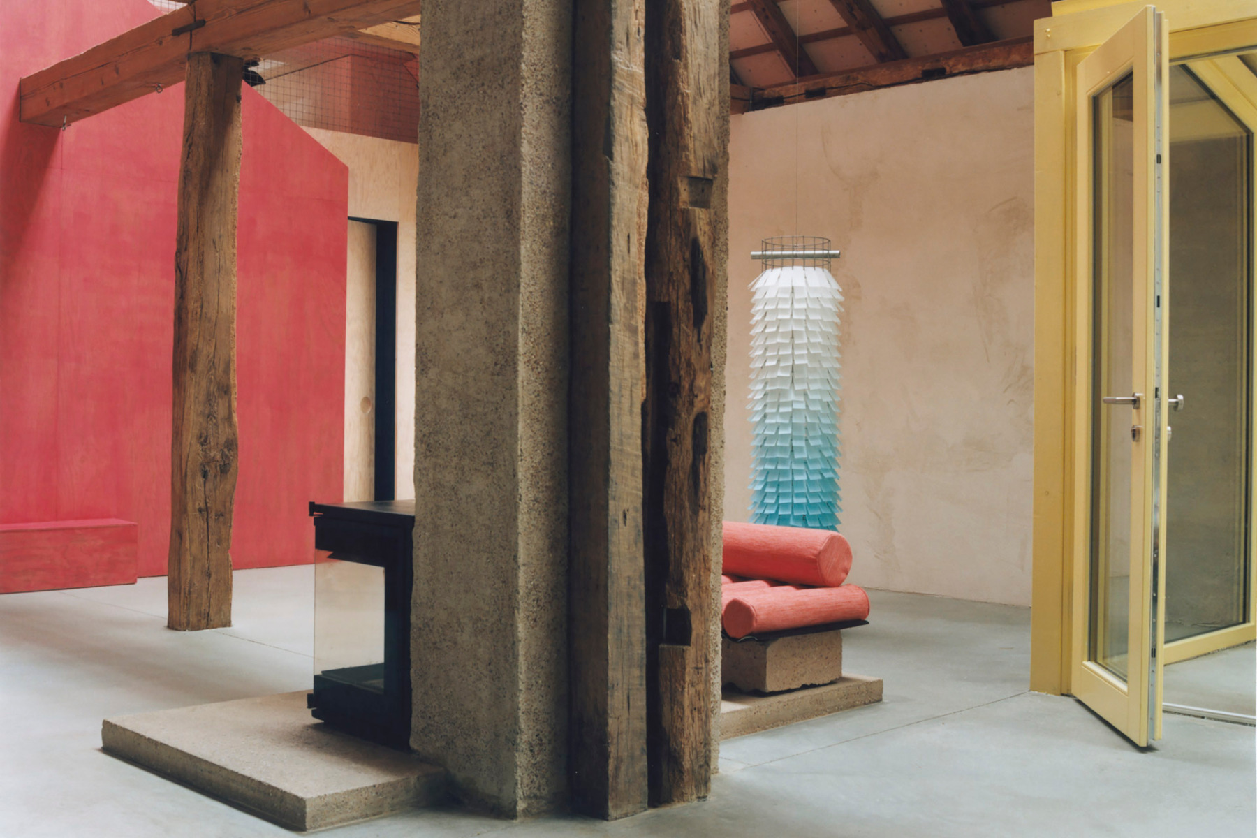 Different coloured huts zone the large interior space. © Simone Bossi