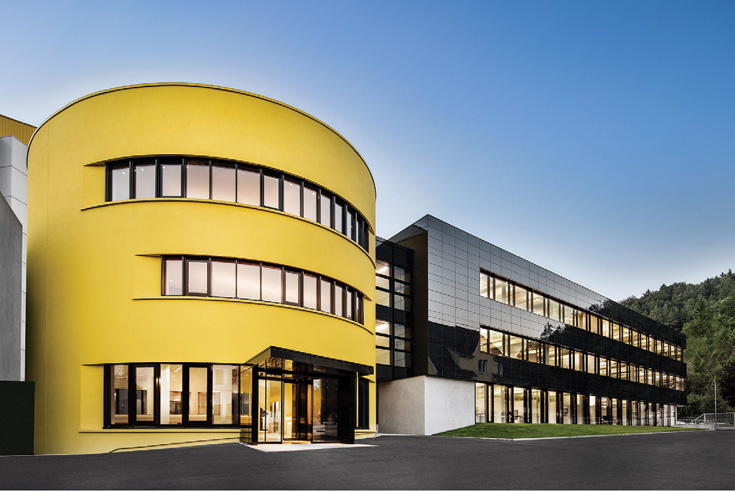 The inauguration of the structures designed by ORANGE BLU (a merging of Wilford Schupp Architects and ZSP Architects | Peter Vorbeck) marked completion of a further milestone in the architects' master plan. The reception building, which in shape and colour recalls the Sto trademark yellow bucket, now forms the focal point of the company grounds. Provided a generously-sized foyer on the ground floor and several meeting rooms and a roof terrace further up, the reception building leads over to its companion piece, a three-storey, 60-metre-long building accommodating a data centre and office space for up to 150 employees. Both buildings have a reinforced concrete structure and feature a number of innovations from Sto's product range. These include newly-developed ceiling elements deployed not only for acoustic purposes but also heating and cooling, and biaxially curvable StoVentec panels, which have been found extensive use in the project. The buildings' energy concept, which seeks to substantially minimise energy requirements by both passive and active means, played a large role in securing DGNB's platinum certification. The concept includes a rooftop solar array with an annual output of 26,400 kilowatt hours, and also features a non-bearing, back-ventilated facade layer mounted to the southern façade and complemented with invisibly-fixed solar modules that deliver a further output of 15,800 kilowatt hours a year. Black glass panels were installed on the other three facades to create a homogeneous impression. A turbine powered by water from the nearby Ehrenbach stream is a further source of energy.