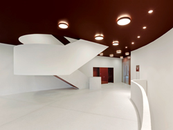 Despite the increasing building density on the Rhine riverfront south of the city centre, the Cologne Oval Offices were designed to maintain the landscape qualities of this area. The two offset volumes also help to integrate an existing 12-storey block into the lower-height urban fabric. Each volume contains three cores, around which the functional areas are laid out in a curving strip. Internal finger-like soffit “sails”, which play an acoustic role, also serve to define working zones and to mask various technical systems. The architects drew up the concepts for the different kinds of offices, whereas the internal finishings were executed in accordance with tenants’ wishes. The extensively glazed facade allows good daylighting, while nearly 5,000 external folding shutters reduce solar heat gains. Printed externally in various shades, the shutters lend the outer skin an iridescent coloration. In summer, temperatures are cooled by a heat-exchange unit using filtered water from the Rhine at 14 –16 °C. In winter, the circuit is warmed by means of district heating.